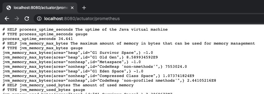 웹 브라우저에서 /actuator/prometheus로 접속해보면 이미지와 같이 prometheus 형식의 메트릭 정보가 출력되는 것을 확인 할 수 있습니다.