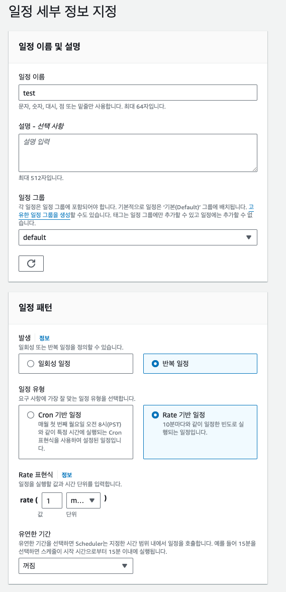 EventBridge 콘솔에 접속해 일정 생성 버튼을 눌러 스케쥴러를 생성해보겠습니다. 예제의 경우 Rate 기반 일정을 사용해 1분 마다 Event가 발생하도록 설정했습니다. EventBridge는 Rate 기반 일정과 Cron 기반 일정을 같이 지원하므로 편리하게 스케쥴러를 설정할 수 있습니다.