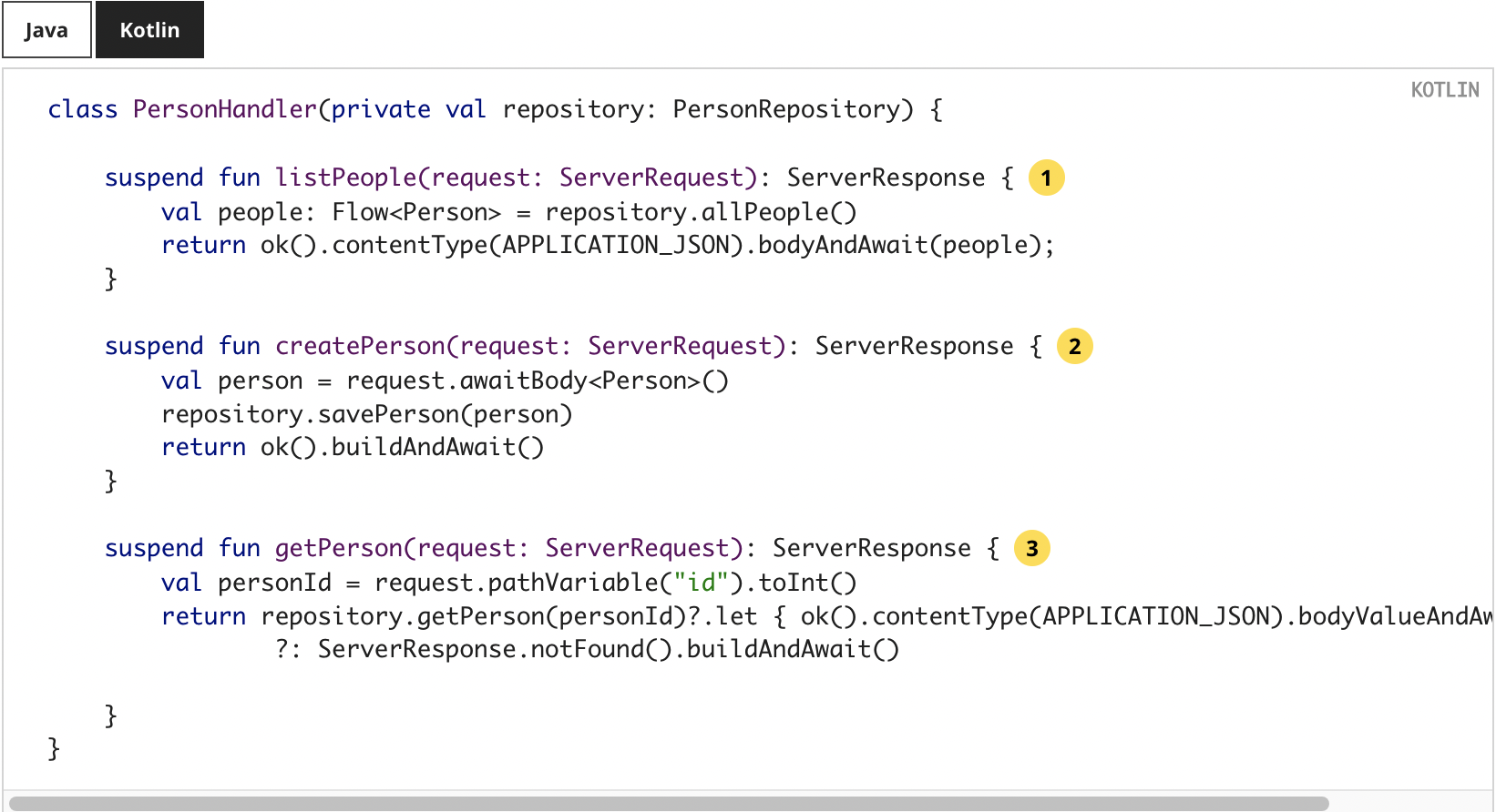 스프링 프로젝트는 코틀린에 대한 지원을 점점 늘리고 있는데 최신 스프링 프로젝트 공식 문서를 보면 자바 예제외에도 코틀린 예제를 쉽게 확인할 수 있습니다. 또한 코틀린이 제공하는 여러 라이브러리도 스프링 프로젝트에 기본으로 탑재되고 있는데 리액터 또한 리액터 코틀린 확장(reactor-kotlin-extensions)을 지원합니다 . 리액터 코틀린 확장 기능을 사용하면 코틀린의 우아한 문법을 사용해 리액터 코드를 자바를 사용했을 때보다 더 간결하게 작성이 가능합니다.