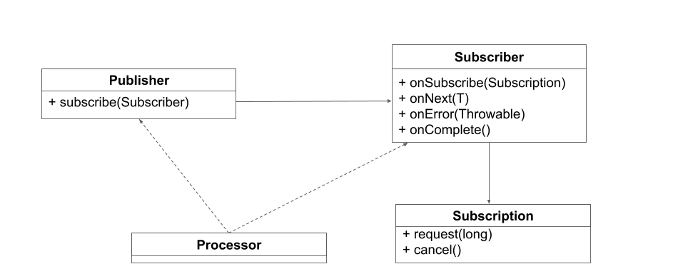 서브스크립션(Subscription)은 발행자와 구독자를 연결 하는 매개체이며 구독자가 데이터를 요청하거나 구독을 해지하는 등 데이터 조절에 관련된 역할을 담당합니다. 프로세서(Processor)는 발행자와 구독자의 기능을 모두 포함하는 인터페이스이며 데이터를 가공하는 중간 단계에서 사용합니다.