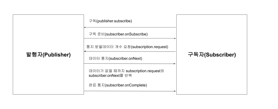 발행자는 subscribe에서 구독자인 Subscriber를 등록하고 구독자에게 데이터를 순차적으로 통지합니다. 이때 발행자는 구독자가 요청한 만큼의 데이터를 통지합니다. 또한 발행자는 구독자가 요청한 데이터를 처리하는 중에 에러가 발생하거나 또는 완료 처리 신호가 발생하게 되면 더 이상 데이터를 통지하지 않습니다. 그리고 subscribe에서 전달받은 구독자가 null이라면 즉시 java.lang.NullPointException을 발생시킵니다.